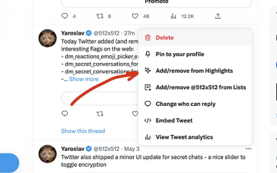 Como puede ver en este ejemplo, la nueva pestaña Aspectos destacados pronto se agregará a su perfil, mientras que también se agregará una opción adicional al menú de tres puntos en los tweets para agrega ese tweet a tus Highlights.