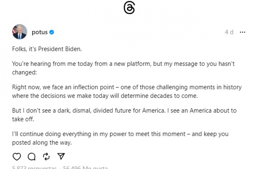 El presidente de los Estados Unidos, Joe Biden, se registró hoy para obtener una cuenta de Threads, al igual que la Casa Blanca, la vicepresidenta Kamala Harris y el segundo caballero, Douglas Emhoff.