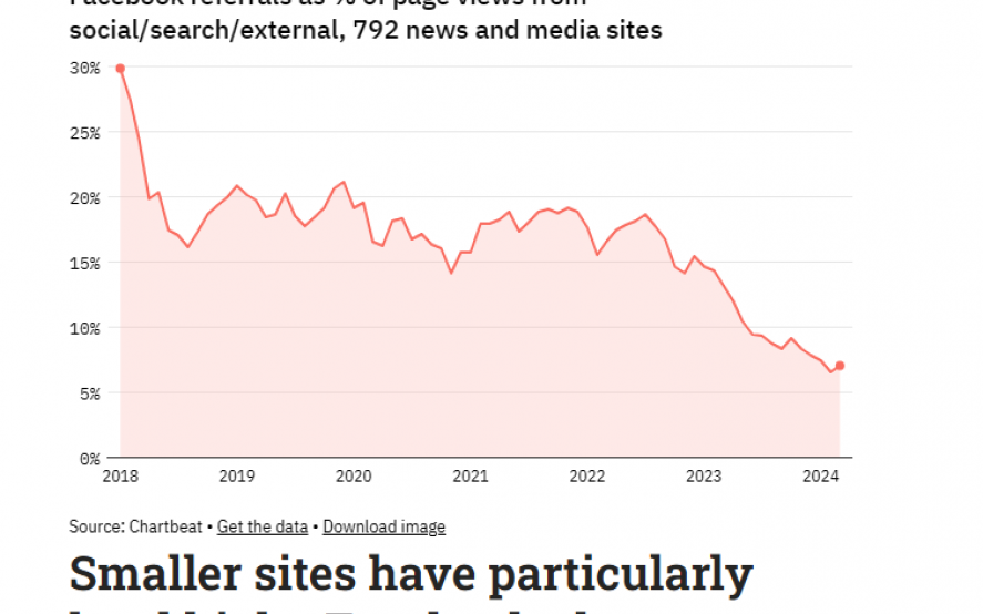 Como porcentaje del total de visitas a páginas provenientes de fuentes externas, de búsqueda y sociales, las referencias de Facebook son ahora menos de una cuarta parte de su nivel de 2018, frente al 30% en marzo de 2018 al 7% en marzo de 2024.
