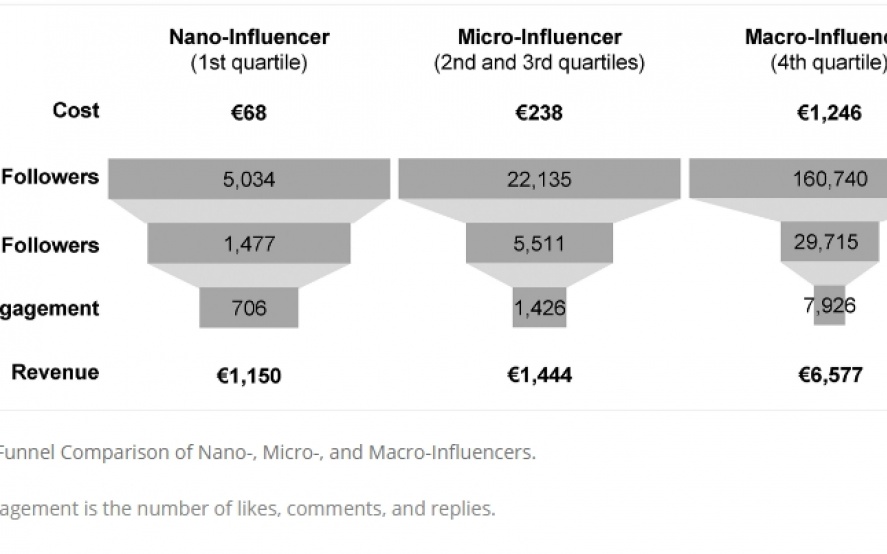 Descubrieron que los nano influencers, aquellos con menos de 10,000 seguidores, producen un rendimiento promedio notable de más de $ 1,000 en una inversión de $ 50, el valor típico de los productos gratuitos que reciben. Por el contrario, los macro influencers, aquellos con más de 100,000 seguidores, tienen un precio elevado de más de $ 1,000, en promedio, pero ofrecen un retorno de solo $ 6,000.