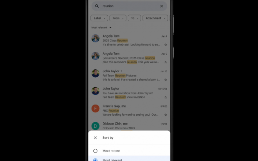 Google también presenta un nuevo botón para alternar entre los correos electrónicos "Más relevantes" y "Más recientes" en la página de resultados de búsqueda. Este botón está dirigido a quienes prefieren ver los resultados de búsqueda en orden cronológico, en lugar de la nueva opción predeterminada "Más relevantes".