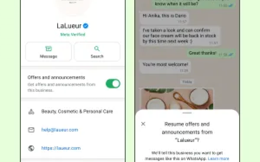 - Comentarios sobre mensajes: WhatsApp ofrece herramientas para compartir comentarios sobre los mensajes que reciben de las empresas mediante los botones de interés y desinterés al recibir ofertas y anuncios, como cupones para rebajas navideñas, información sobre nuevos productos, alertas de disponibilidad o recordatorios de próximas ofertas y eventos. También pueden activar o desactivar la opción de recibir este tipo de mensajes en cualquier momento.