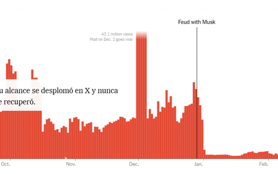 La Sra. Loomer también perdió brevemente el acceso a X Premium tras una disputa con el Sr. Musk, lo que podría haber explicado la caída en la popularidad de sus publicaciones. Sin embargo, un análisis del Times no halló una relación clara entre la popularidad de sus publicaciones y el momento en que fue expulsada y reincorporada al programa.