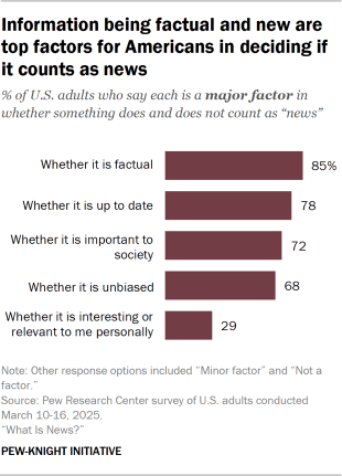 Estas percepciones también surgen en los datos de nuestra encuesta: los adultos estadounidenses son los más propensos a decir que el hecho de que algo sea factual (85%) o que esté actualizado (78%) son factores importantes a la hora de pensar si cuenta como noticia.