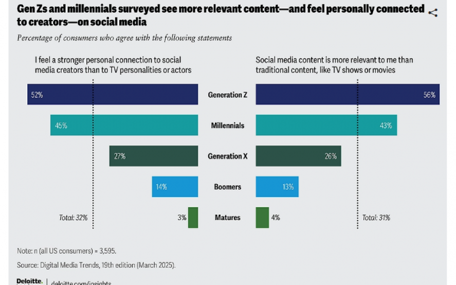 El informe Tendencias de Medios Digitales 2025, publicado recientemente, mostró que el 52% de la Generación Z afirmó sentir una "conexión personal más fuerte" con las estrellas de redes sociales que con las personalidades de la televisión o los actores. Y el 56% afirmó que el contenido de redes sociales es "más relevante" para ellos que las series o películas.