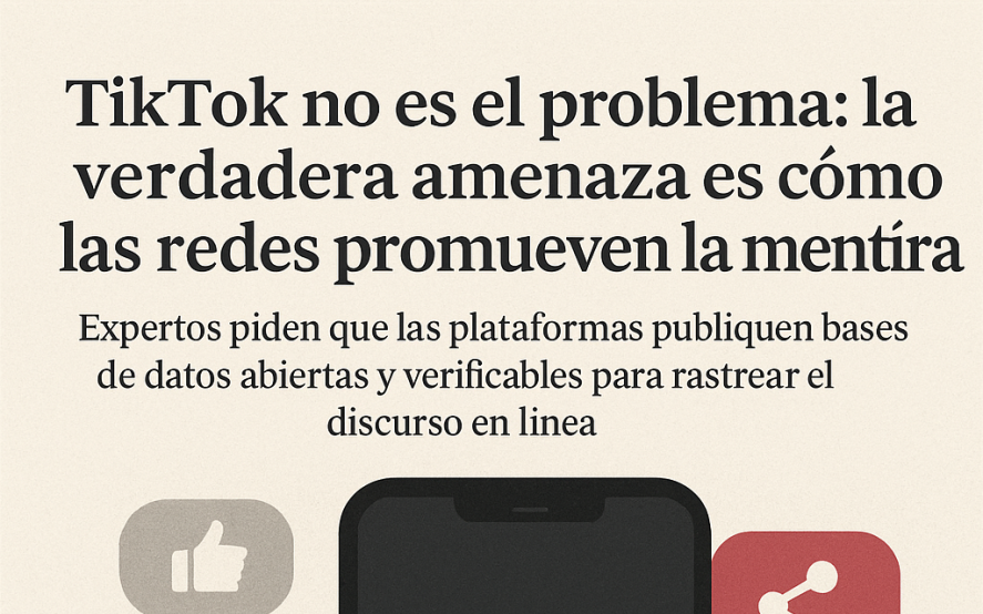 ¿Acaso TikTok (o Instagram o YouTube) amplifica o suprime la libertad de expresión para contentar al Partido Comunista Chino o a la Casa Blanca, para quedar bien o para perjudicar a sus competidores? En lugar de simplemente preguntarnos y preocuparnos, deberíamos poder responder a estas preguntas con datos y rigor. La alternativa es seguir permitiendo que las plataformas controlen la narrativa sobre sus propios efectos en la sociedad. Tenemos razones de sobra para concluir que este enfoque no funciona.