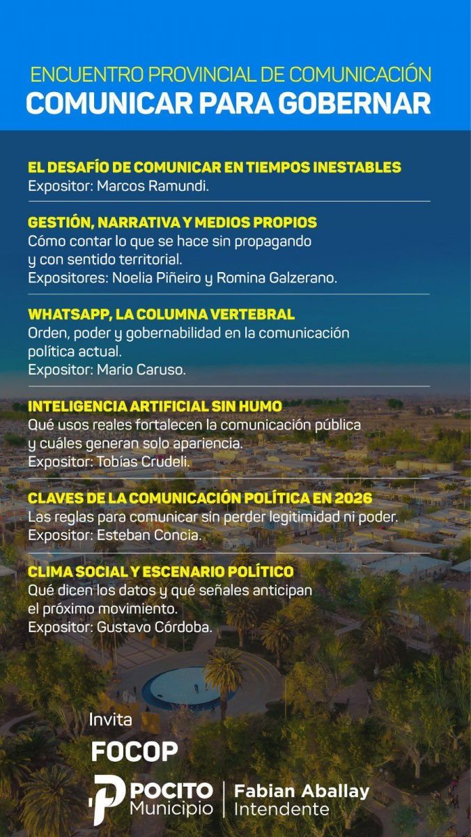 El próximo jueves 26 de marzo se realizará en la ciudad de Pocito, San Juan, el Encuentro Provincial de Comunicación “Comunicar para Gobernar: Poder, agenda y consenso en contextos complejos”, una jornada gratuita y abierta a todo público que reunirá a especialistas en comunicación política, análisis social, gestión pública e innovación tecnológica aplicada a los gobiernos locales.