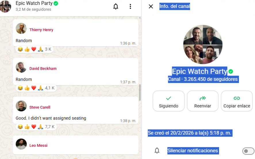 El chat grupal presenta celebridades como Lionel Messi, David Beckham, Alexia Putellas, Thierry Henry y Steve Carell —, quienes publican fotos, notas de voz y mensajes sobre el evento deportivo.