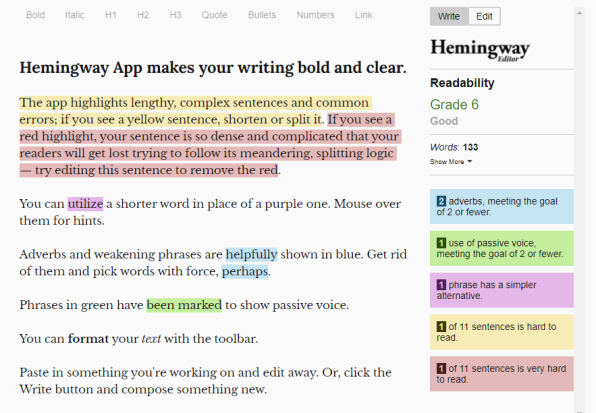 El editor gratuito de Hemingway se desarrolló para ayudar a los escritores a mejorar mediante una puntuación de "legibilidad", que muestra lo difícil que es leer un texto.