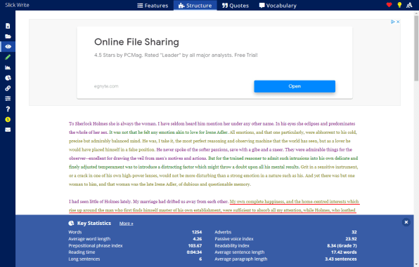 Slick Write, en parte un procesador de texto basado en la web y en parte un país de las maravillas estadístico, puede ingerir documentos que ha escrito en otros programas o ayudarlo a escribir en tiempo real.