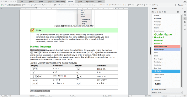 Su procesador de texto, Writer, proporciona una excelente manera de producir y editar contenido escrito, con una apariencia similar a la de Word y la capacidad de exportar documentos en múltiples formatos universalmente compatibles. Viene con un corrector ortográfico y gramatical interactivo, así como un diccionario de sinónimos y rimas, entre otras características.