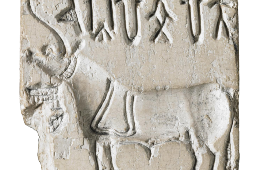 Un sello hecho de esteatita blanca vidriada con un toro de pie sobre un pesebre, encontrado en Babilonia, Irak. Los fideicomisarios del Museo Británico