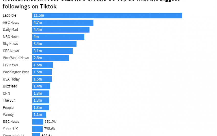 La marca más grande y conocida de la compañía, Ladbible, actualmente cuenta con 11,5 millones de seguidores en Tiktok, casi tres veces más que la siguiente marca de noticias británica más grande en el ranking de las 50 mejores de Press Gazette según un análisis reciente de Press Gazette.